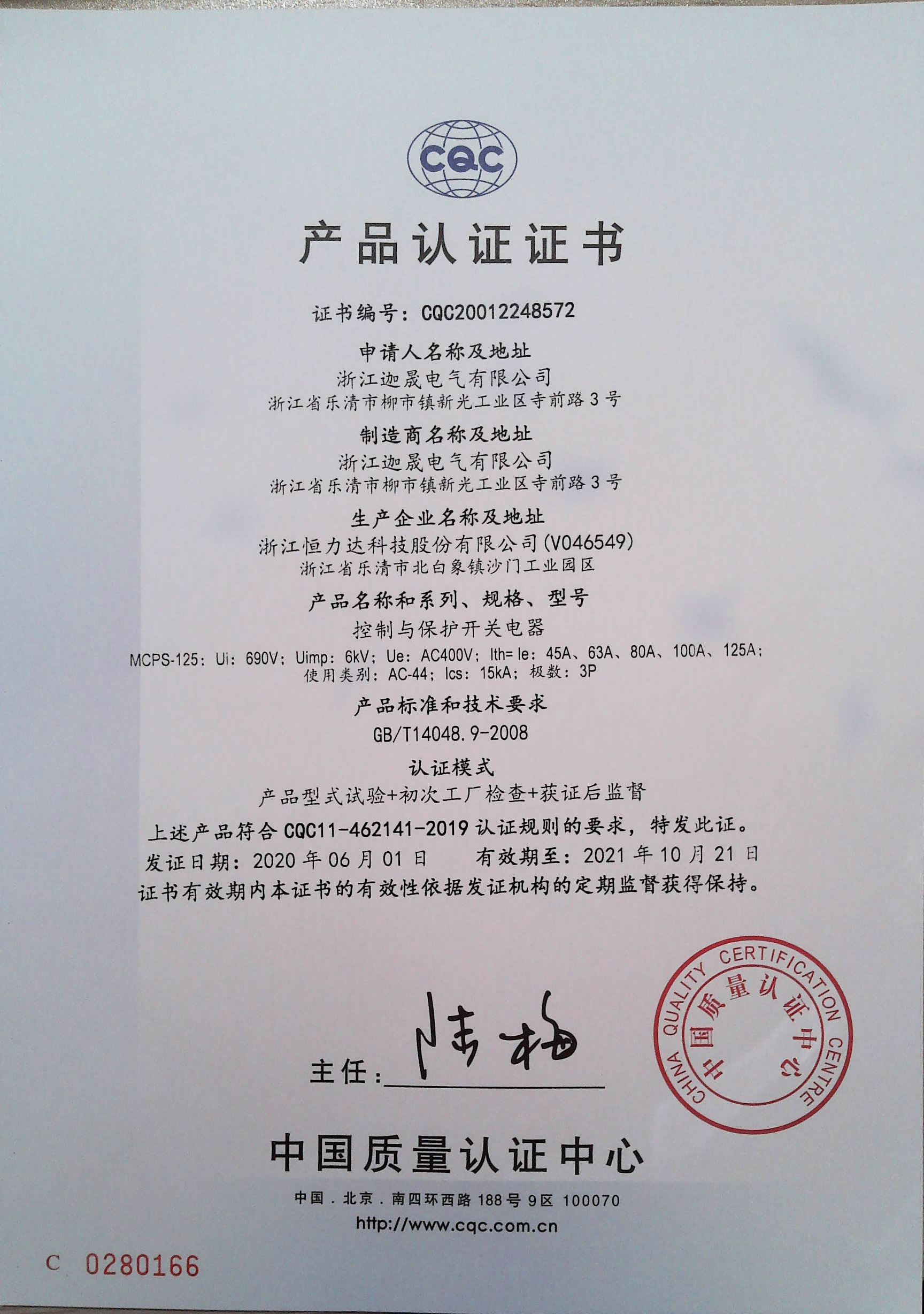 MCPS-125控制保护开关CCC证书