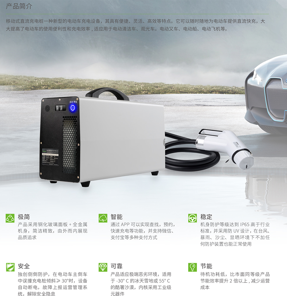 移动式直流充电桩一种新型的电动车充电设备,其具有便捷、灵活、高效等特点。它可以随时随地为电动车提供直流快充,大大提高了电动车的使用便利性和充电效率,适应用于电动清洁车、观光车。电动又车、电动船、电动飞机等。